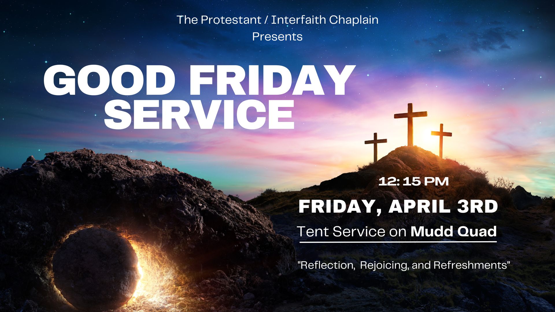 Come and Celebrate Good Friday on Friday, April 3rd on the Mudd Quad. Service starts at 12:10pm Food will be served afterwards. Open to everyone. For More information contact Bridgette.bentley@claremont.edu |